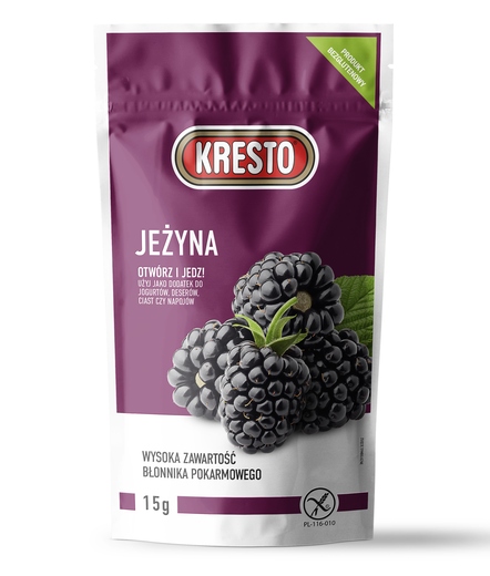 W procesie liofilizacji jeżyny zostały zamrożone, a następnie pozbawione wody. Dzięki temu można cieszyć się smakiem i aromatem owoców przez długi czas oraz sięgać po nie o dowolnej porze roku. Proces liofilizacji umożliwia zachowanie wysokiej zawartości składników odżywczych – owoce są pożywne, chrupiące i mają intensywny smak oraz aromat. Produkt jest bezglutenowy i nie zawiera dodatku cukru. Do wyprodukowania 100g jeżyny liofilizowanej zużyto 0,7 kg jeżyny świeżej.